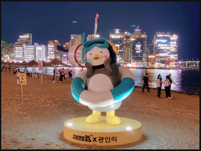 광안리에는 펭수가 등장했습니다. 7월 1일부터 광안리 해수욕장에서 펭수의 조형물 제막식과 마스크 씌우기 퍼포먼스 등 다양한 생활 속 거리두기 캠페인을 진행하고 있습니다.