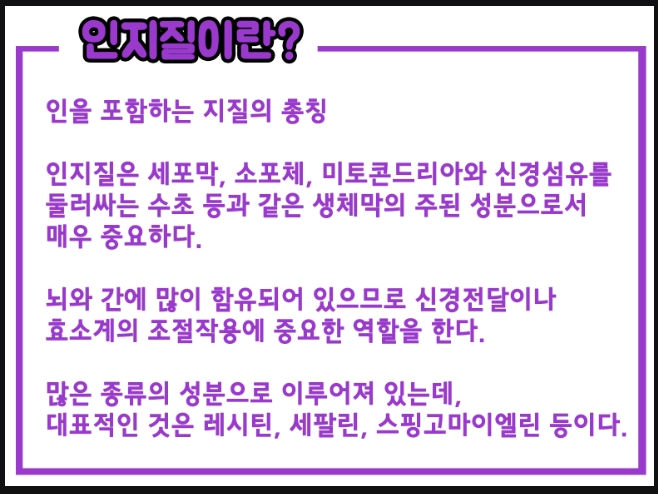 인지질은 생명의 기본 요소라고 할 수 있는데, 세포막이나 적혈구, 뇌세포 등의 주요 성분이며, 특히 뇌의 60%를 구성하고 있는 만큼 중요한 역할을 합니다.