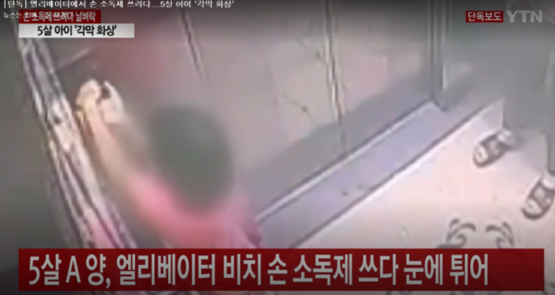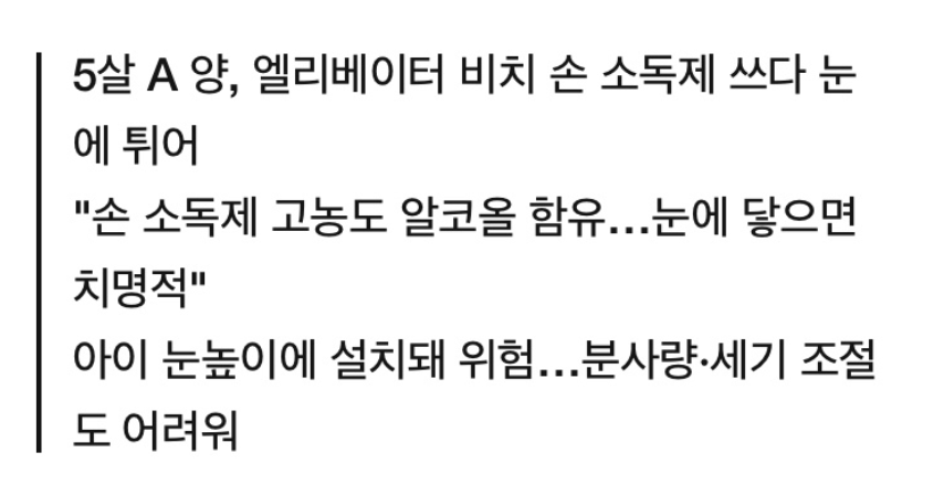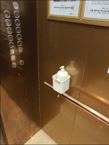 보통 승강기에 비치된 손 소독제는 승강기 내부 손잡이에 부착되어있는 경우가 많은데 이는 아이들이 사용하기에는 다소 높은 위치이기도 하며 아이들의 눈높이 근처이다 보니 키가 작은 아이들은 손을 머리 위로 뻗어 손 소독제를 사용하다 바로 눈에 튈 수 있는 위험이 있는 것입니다.