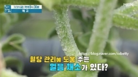 아이스플랜트에는 중성지방을 억제하는 마이요이노시톨(myoinositol)과 혈당치를 낮추는 피니톨(pinitol)이 다량 함유하고 있어 잎과 줄기를 생식하거나 즙으로 먹으면 당뇨병 환자에 좋은 음식입니다.